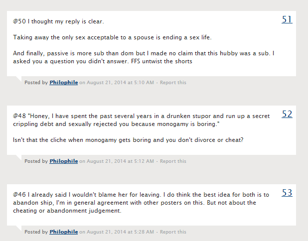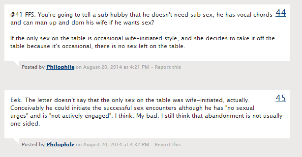 Translation: if THATH’s hubsand can has sex with her with the vigor of a piece of dead wood then THATH should be trying her mightiest to right what’s wrong in their sex life. And maybe, Philophile writes, the problem is THATH: