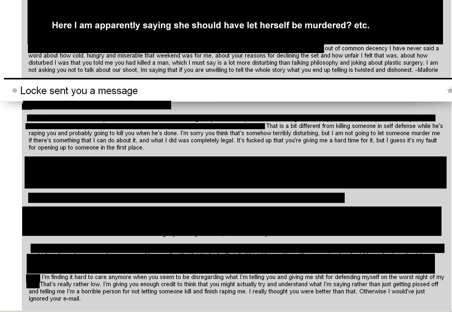 The smoking gun is a mostly censored email exchange between Nasrallah and Locke/Zoe. These weren’t the first messages exchanged between the two, and Nasrallah gives us no sense of context to Locke’s/Zoe’s words because most of her prompting message is censored. So when Locke responds by discussing killing someone in self-defense we have no context for this message, save the one Nasrallah is telling us.