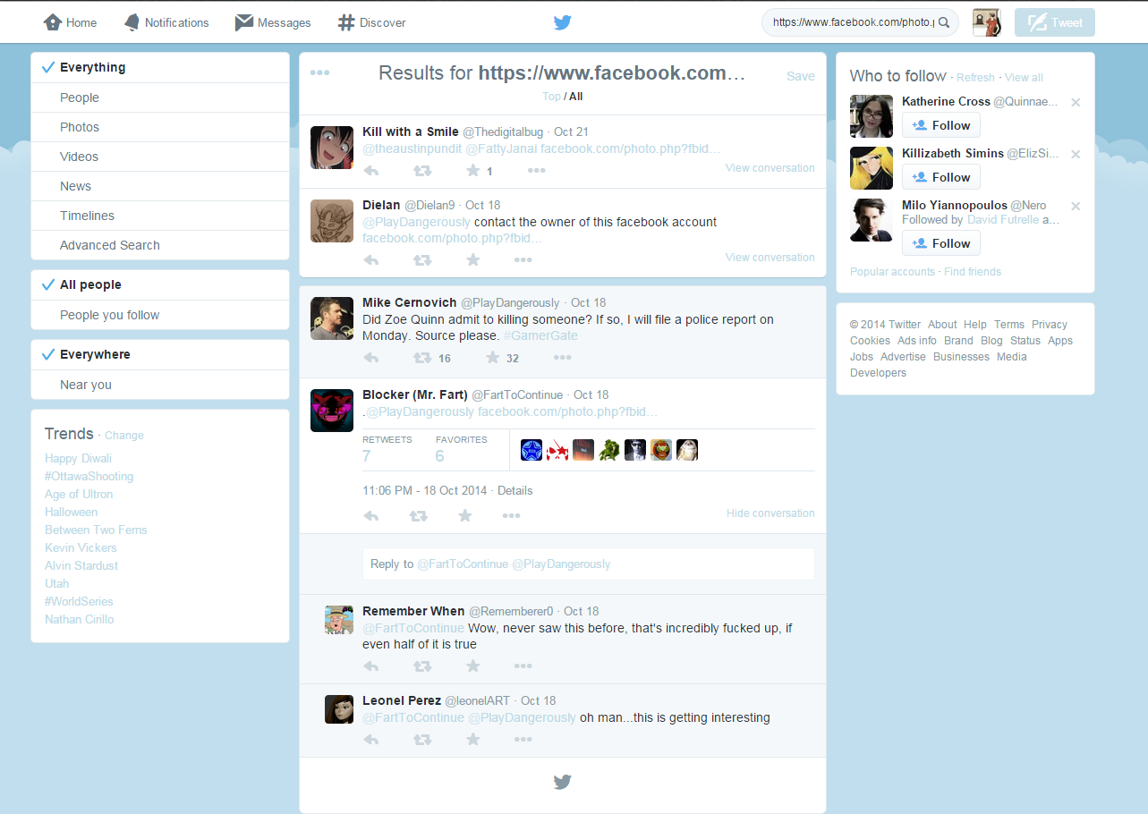 But hey, Mike Cernovich believes it. On Oct 18 he asked #gamergate if Zoe Quinn admitted to killing someone on Twitter.