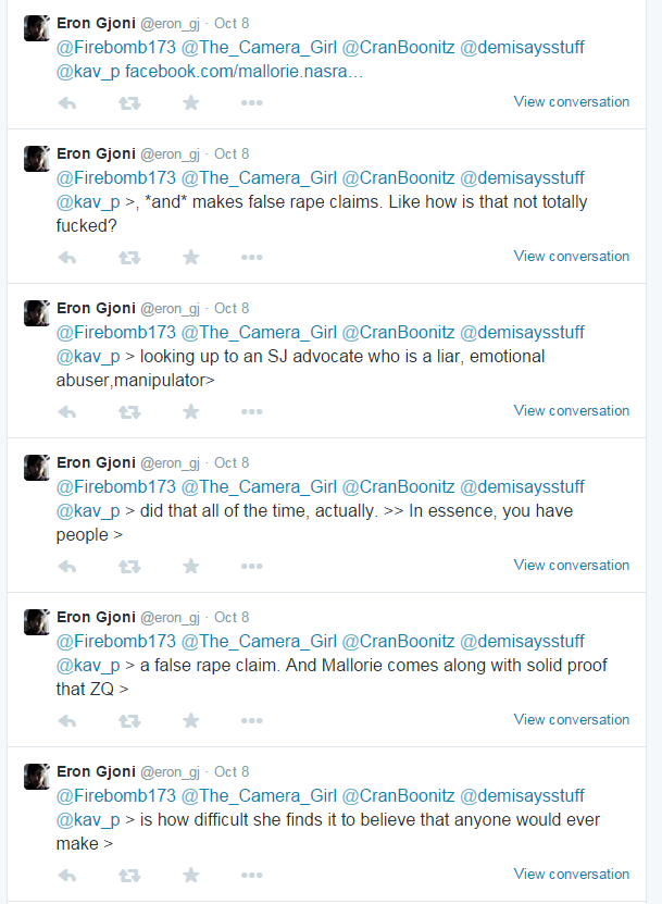 This might be libel, since he’s CCing some of the popular names of #gamergate in these Tweets. And did Eron Gjoni just say Zoe Quinn makes false rape claims? Gross. Don’t let this guy into your social justice club; whatever he thinks theoretically, this is who he is when the rubber meets the road.
