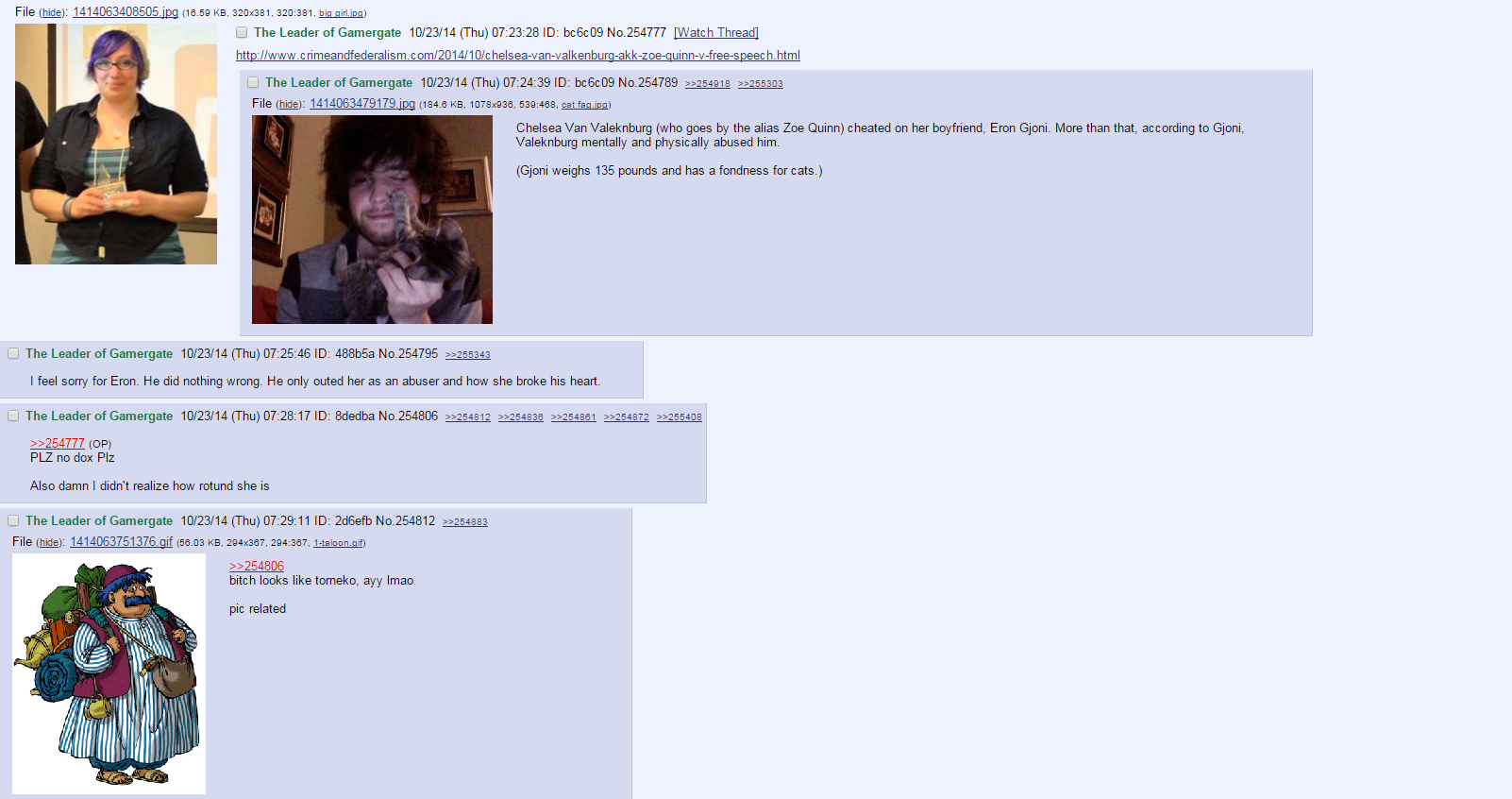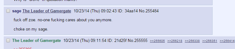 “fuck off zoe. no-one fucking cares about you anymore. choke on my sage” – Anon, not caring about ZQ at all (Source:8chan)