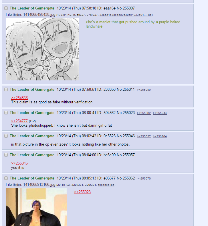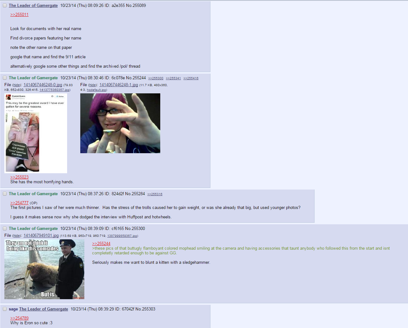 And lest you think I’m cherrypicking, or that hating Quinn is somehow unusual for #gamergate, the thread goes on in this vein. Posting pictures of Zoe Quinn, unflattering photoshops of the same, discussing her appearance, weight, how ZQ makes one 8chan anon want to “blunt a kitten with a sledgehammer.”; it’s all in there! But #gamergate lacks this self-awareness, and would like to think Quinn is so over, even as they spout bile about her at that very moment.