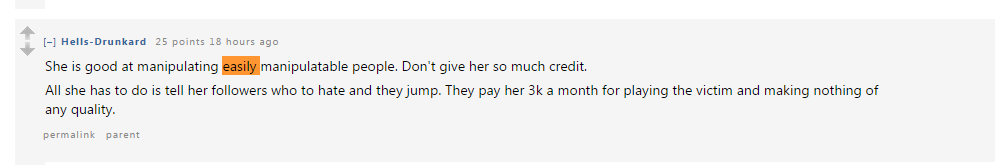 All she has to do is tell her followers who to hate and they jump. They pay her 3k a month for playing the victim and making nothing of any quality.
