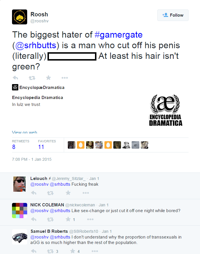 Sarah Nyberg also strikes an intimidating figure to the individual #Gamergater: she might read your site and report your content to administration. I am certain many #Gamergaters (notably Ralph Retort) blame loads of takedowns, bans, seizures etc. on Nyberg, whether she had anything to do with it or not. Her work is threatening to #Gamergate because it exposes them. The attack, then, is to isolate Sarah Nyberg by spreading stomach-turning accusations, so that her following crumbles and she’ll go into Internet exile. This outcome would be great for #Gamergate-aligned sites like Encyclopedia Dramatica and 8chan, who find her reporting inconvenient to their continued operation. In short, Nyberg’s being targeted because she is effective.