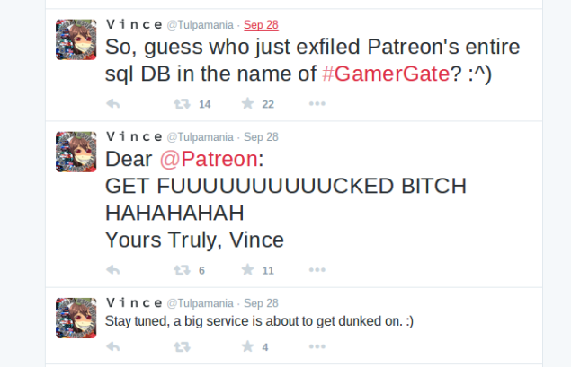 But in three cases I know of, top #Gamergate talking heads were actually targeted by Baphomet. I archived threads from Baphomet discussing the attack as it was in progress and documented these attacks in this space. In each case, I hoped that these Gamergate de facto leaders would actually look at the Baphomet threads, but none of them seem to want to see the sausage getting made, as it were. Still, it seems important enough for me that I want to review these attacks, to illustrate how Baphomet will hurt people within #Gamergate, the group that shelters Baphomet and profits off Baphomet’s work.
