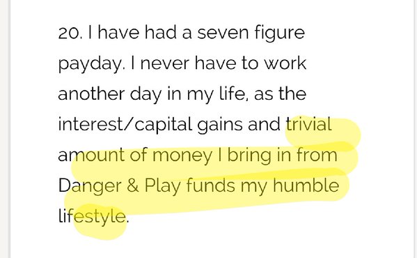 But in recent weeks I have learned that my fears were unfounded. Cernovich has never sued anyone: although he boasts of having his law blog credited twice in unpublished court decisions, there does not seem to be a single decision from any court in America in which he is credited as acting as counsel — state or federal. He appears to have obtained a law license in 2013 (nine years after graduating law school) yet there is no evidence he did anything with it except posture on the Internet. The closest Cernovich’s ever seems to have gotten to being a practicing lawyer was doing scut legal writing work on contract and blogging about law while being married to a law school classmate. This classmate apparently went on to become an IP attorney with several well-known, hugely successful public tech companies, while Cernovich stayed at home. The financial success Cernovich advertises as his own is almost certainly due to a “seven-figure payday” his ex-wife was forced to give Cernovich from her tech stock awards as part of their divorce settlement. (Michael himself appeared to confirm many of these details in a series of Tweets published and then deleted in the past fortnight.) Yet, in public, Cernovich is more than willing to criticize people who collect alimony.