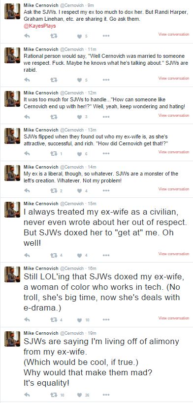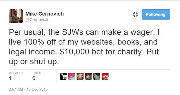 Cernovich is a Potemkin alpha male whose success in life is as artificially inflated as his testosterone levels. He bullies people more famous than himself in order to obtain what are by his own description modest pageviews and z-grade notoriety, and says extreme things he doesn’t believe so reactionary dregs will consider buying his e-books. And as he presumably whittles away his savings from the proceeds of his ex-wife’s hard-earned IPO windfall, I expect he will only become more desperate for attention and money.